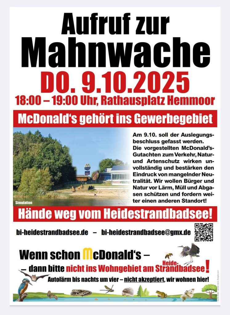 Daher ruft die Bürgerinitiative „McDonald‘s am Heidestrandbadsee – Nein, danke!“ am 09.10.2025 zur Mahnwache vor dem Rathaus von Hemmoor auf. 🪧🍟🤚